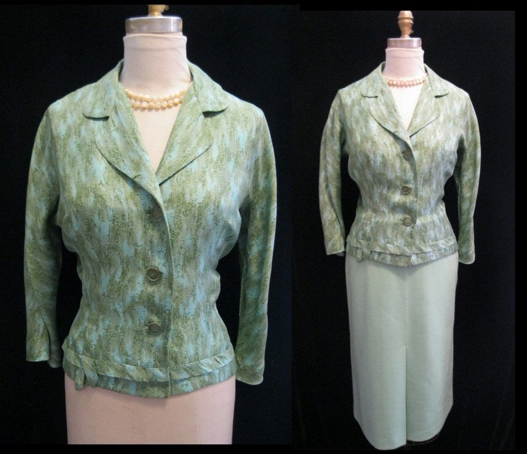 Vintage 50s Silk Shantung Suit Jacket Green Abstract Print Etsy Uk